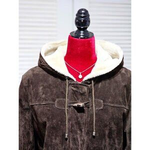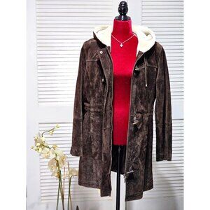 Covington Women's Brown Suede Leather Coat Faux Shearling Hood Size L 2203