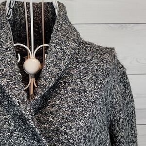 Heavyweight cotton acrylic blend marled grey pullover sweater by Covington with a shawl collar, long sleeves with ribbed cuffs, and a fitted hem. Great pre-owned condition with normal signs of wash and wear.