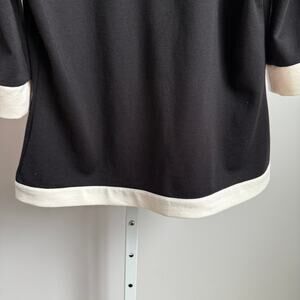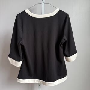 This is a pre-owned Covington brand jacket, size M/M. It features a black body with white trim around the collar, front opening, and sleeve cuffs. The jacket has a button-up closure with six round, light-colored buttons. There are two decorative pockets at the front. The jacket has 3/4 sleeves. The material appears to be a knit blend. There are no immediately visible imperfections.