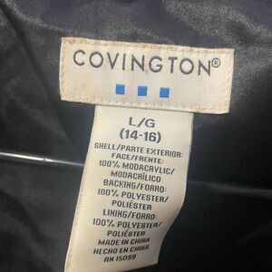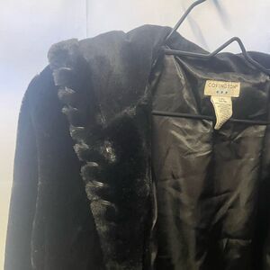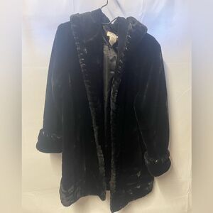 Super soft and thick faux fur coat, length goes just past the hips. Has some faux leather stitching around hoods and clasp closures at front. Great used condition, size L