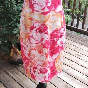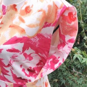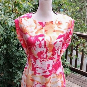 Soft textured fabric and design make this dress stand out. Sheath style, small slit at neckline. Unusual, deep arm opening, lined under so you don't show. Fully lined, back zip . Size 6 measures 36 at chest, 28 at waist, 38 at hips and bottom hem. 40 long from shoulder to hem. Beautiful warm floral colors.