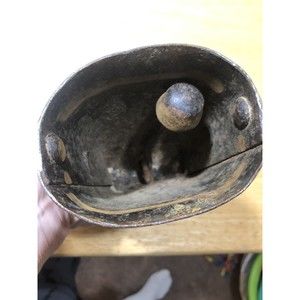 Cowbell Bell Primitive Folded Riveted Metal Handle Large Loud Clacker Decor Antique cow bell, folded metal with rivets,hand, this is large and it rings really loud. Looks like the original clacker. Im sure it could be used or for rustic western decoration