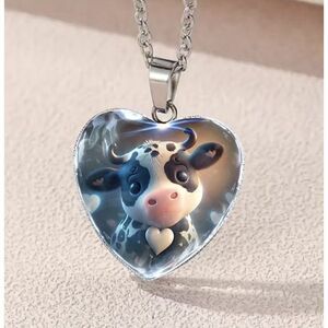 Cow Heart Shaped Crystal Pendant Necklace. 3D Cow. New. 5