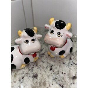 Cow Porcelain Salt & Pepper Shaker Set Horned White Black Yellow With Stoppers