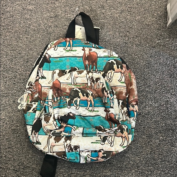 Stylish backpack with a cow print design. Features a mix of brown, black, and white colors with turquoise accents.
