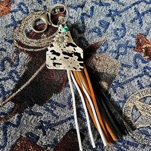 Stylish cow print keychain with tassel accents. Perfect for adding a touch of flair to your accessories.