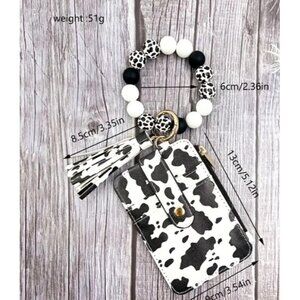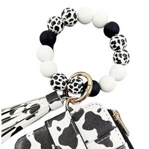 Stylish cow print wallet keychain featuring a beaded bracelet and tassel key ring. Ideal for carrying essentials in a compact, fashionable way.