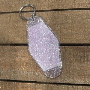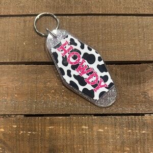 Stylish cow print keychain with bold pink 'Howdy' text. Perfect for adding a fun touch to your keys.