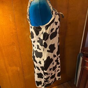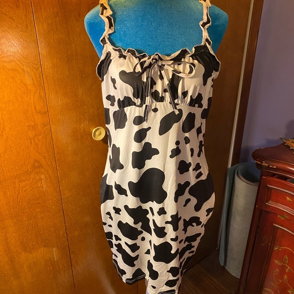 Stylish cow print dress with ruffle details. Perfect for a bold look.