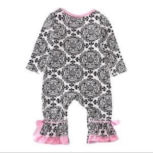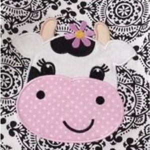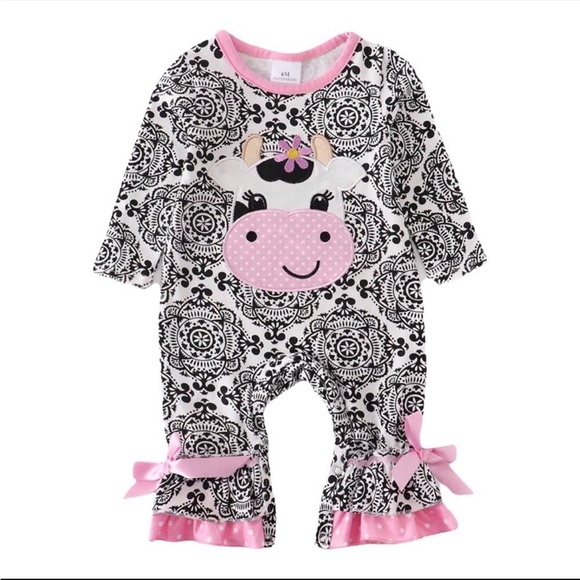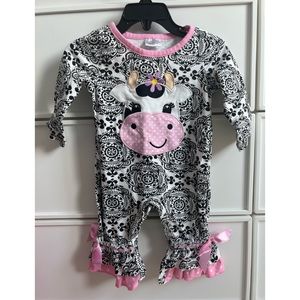 Adorable cow print romper with purple flower and pink polka dot print. Ruffle detail at bottom with pink ric rac, pink bow and polka dot detail. Snaps at pant legs for easy diaper changes. Purchased from a boutique gift shop I. Louisiana. Unfortunately baby outgrew before we could get her in it. 97% Cotton 3% Spandex