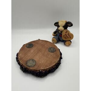 The product is a figurine from Mary's Moo Moos collection featuring a cow wearing suspenders overalls and holding a heart sign. The multicolored design and playful subject make it a charming addition to any collection or as a standalone decorative piece. The brand Mary's Moo Moos is known for its whimsical and adorable cow-themed items, making this figurine a delightful representation of their signature style.
