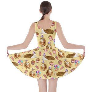 Gently used original CowCow skater dress, size 5X (30/32). Print is a soft buttery yellow background with adorable ginger cats wearing birthday party hats, balloons, and popcorn. So fun!
