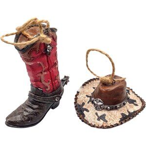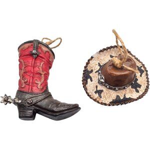 This set includes a cowboy boot and hat ornament, crafted with attention to detail. Ideal for adding a rustic western touch to holiday decorations.