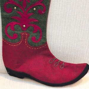 Cowboy Boot Western Christmas Stocking. This fun Christmas stocking features a red and green boot, black heel and sole, brown tab with an orange matte silver button, red scroll work, brass ball accents, gold stitching, and a brown rope detail on the toe. A festive addition to your western themed Christmas! 100% polyester.