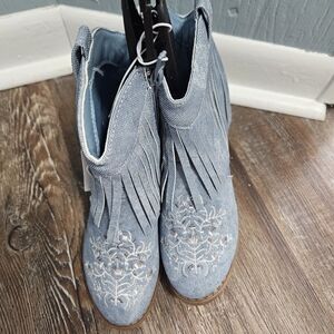 Step out in style with these chic fringed denim ankle boots. Perfect for adding a touch of flair to any outfit.