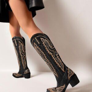 Cowboy Boots for Women - Classic Embroidery, Side Zipper, Chunky Heel