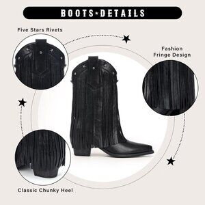TRENDY FRINGE BOOTS: These fringe cowboy boots for women feature an exquisite fringe design. Unlike the traditional round rivet style, the black cowgirl boots incorporate a unique five-pointed star rivets, adding a distinctive sense of dynamism. The cowgirl boots women are the best choice for music parties and traveling.