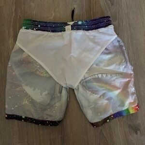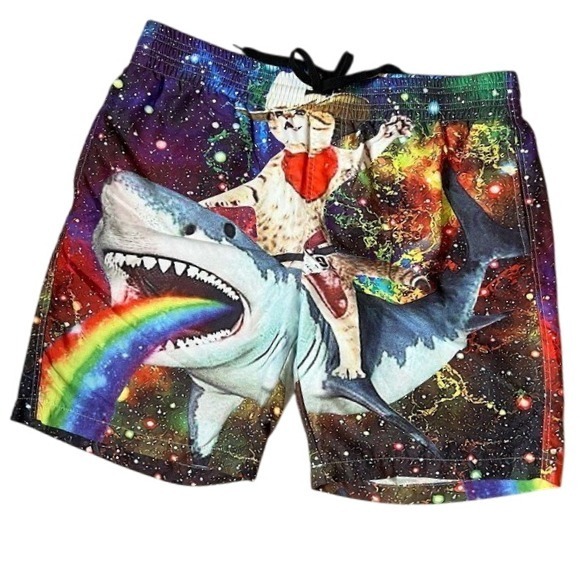 Cowboy Cat Riding Rainbow Shark Double Sided Swim Trunks Elastic Waistband Men M