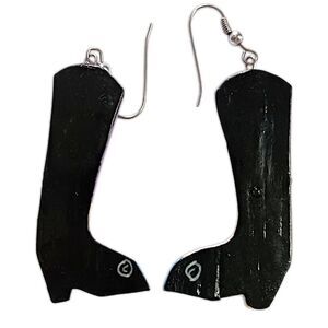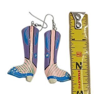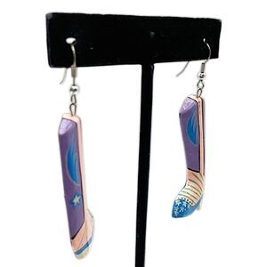 Cowboy Cowgirl Boot Earrings Wood Handpainted Dangle Rodeo Colorful Paper Mache. Condition is pre-owned with no chips or cracks. Made of either paper Mache or wood. There is a signature...unable to detect the maker. Measures about 2.25" long. Very lightweight. Made of either paper Mache or wood. Please see all photos for detailed condition.