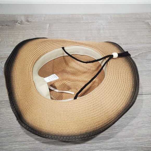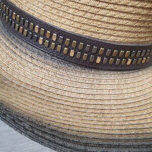 Cowboy Hat Female Foldable Paper Straw Western Cowboy Hat Brown Tan Embellished. Please note size is 56cm-58cm. One small little area on the inside brim has a scuff, see attached picture.