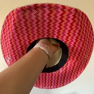 Stylish cowboy hat featuring a sparkling rhinestone trim and unique bottom brim. Perfect for adding a touch of glam to any outfit. Handmade 💖