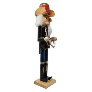 Crafted with wood, this nutcracker is 16" tall and features a man dressed in a black top with a belt and steer belt buckle.  He's holding a lasso and wearing a big cowboy hat.  His boots look like he's ready to climb onto a horse any minute.