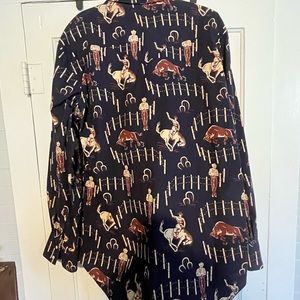 XL Rock & Roll denim button down shirt. Cotton. Worn maybe twice. Shirt is in good shape! The background is navy with tans and browns in the details.