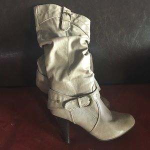Neutral colored 7 1/2 cowboy like boots, very comfortable not too high heel. Cute go perfect with jeans, slightly worn
