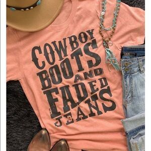 Cowboy boots and faded jeans T-shirt cotton polyester blend available small medium large and extra-large sort of a salmon color