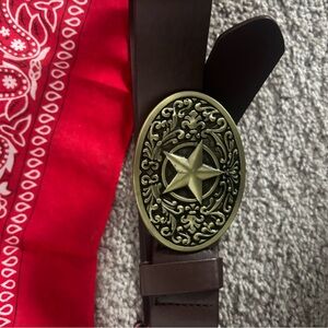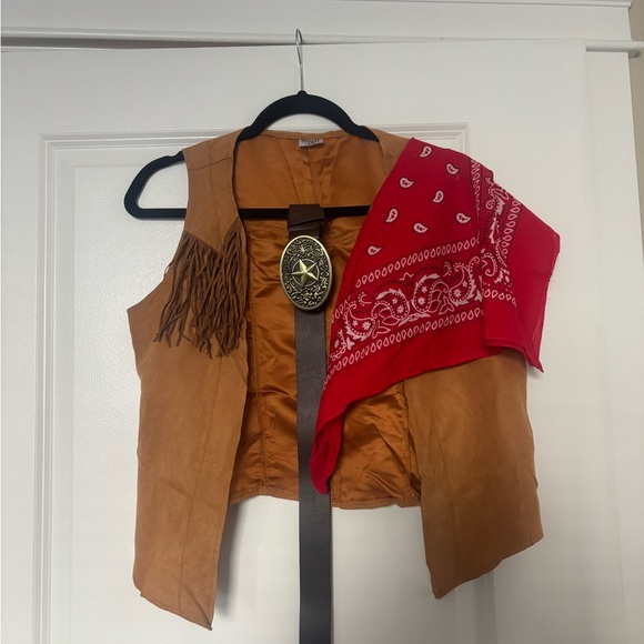 Western-style brown vest with red bandana. Ideal for cowboy themes.