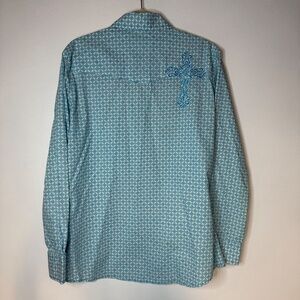 Cowgirl Hardware Blue Pearl Snap Shirt Embroidered Western Christian Cross - U
