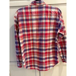 This is a Cowgirl Hardware long sleeve flannel shirt in size small (2-6) designed with a plaid pattern in multicolor. It features a collared neckline and a button-up front. The shirt is made of flannel fabric and has a classic/fitted sleeve type, providing a regular fit for a cowgirl-inspired look. Perfect for women who appreciate a basic, Western style in their wardrobe.