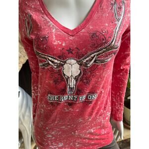 Cowgirl Hardware Hunters V-Neck Red Long Sleeve Shirt Women's Size Medium. Measurements: bust: 17, length: 27