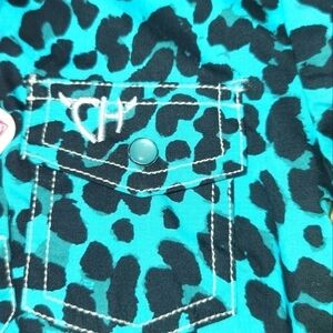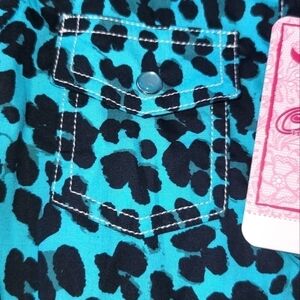 This is the perfect onesie for any cowgirl in the making! Stylishly designed with cow print pearl button snaps, double stitch yoke and a vibrant blend of teal and black, this onesie is as stylish as it is comfortable.