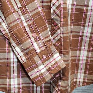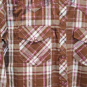 Cowgirl Hardware Sz S Brown Pink Metallic Plaid Studded Pearl Snap Western Shirt