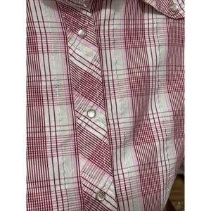 Like new Cowgirl Hardware women's large pearl snap button up western work shirt. Pink/white plaid. Front breast pockets on sides. Measures 19 inches across the chest, 22 inches shoulder to hem and 24 inches shoulder to the end of the sleeve.