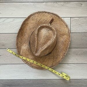 Stylish brown straw cowboy hat featuring an embellished band. Perfect for adding a rustic touch to any outfit.