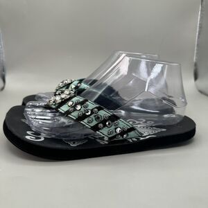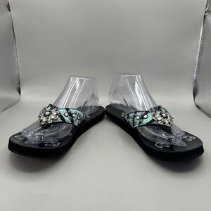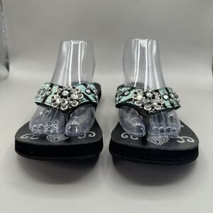 Cowgirl Jewels Rhinestone Turquoise Black Leather Flip Flop Sandals Size 8