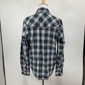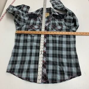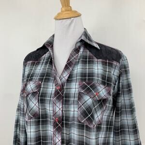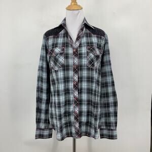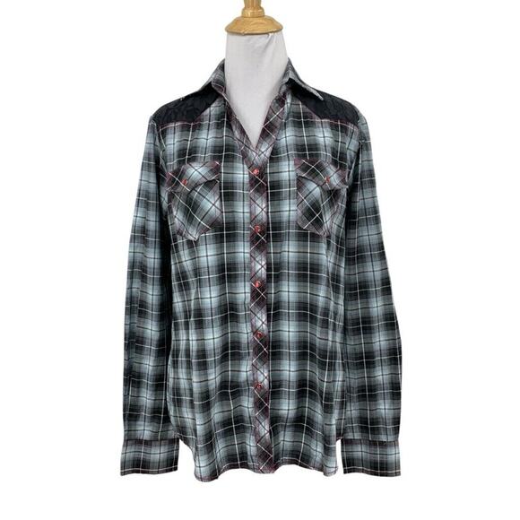 Cowgirl Legend Shirt Women L Large Gray Pink Lace Panel Plaid Pearl Snap Western