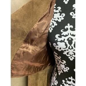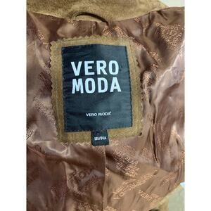This is a stylish Vero Moda leather jacket for women in size S. It features a solid brown color with a zip closure and polyester lining. The jacket has long sleeves and a short length, suitable for travel or casual wear. With accents like zippers, it offers a regular fit and is lightweight for all seasons. The design is influenced by Western, Aztec, and Bohemian themes, making it a chic addition to any wardrobe.