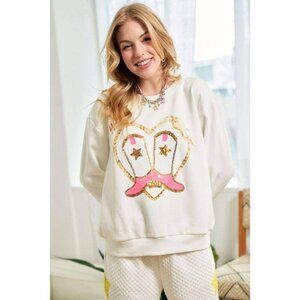 Western Rope Print With Sequin Boots Patch Sweater Top "Kick up your style with this playful Cowgirl Rope Print With Sequin Boots Sweater! You'll be catching eyes and compliments left and right with its unique Western Rope Print and trendy Sequin Boots Patch. And with its cozy sweater top, you'll be both stylish and comfy - a perfect combination for any cowgirl!" 60% POLY 36% COTTON 4% SPAN