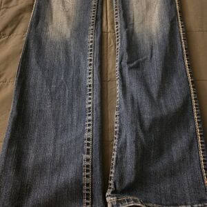 Stylish boot cut jeans. Features classic blue denim. Embroidered back pockets. Perfect for casual wear.