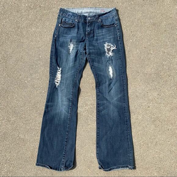 Cowgirl Tuff Co “Diva” boot cut jeans. Factory distressed with rhinestones peeking through