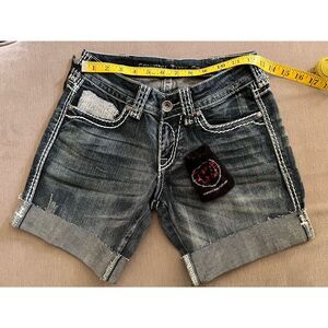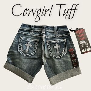 This is a listing for a pair of Cowboy Tuff shorts, style name “Crosses Shimmer” in Size 25 (US 2). This pair of shorts are NWT and have been stored in a pet friendly, smoke free home.