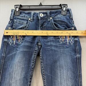 Cowgirl Tuff Women's Jeans. Blue in color. Medium denim wash. Tagged size 24x33 (0). These women's Cow Girl Tuff jeans feature a five pocket design, Aztec embroidery, a Boot Cut leg and a low rise fit. Style number JAZMST. In preowned condition with minimal signs of wear.