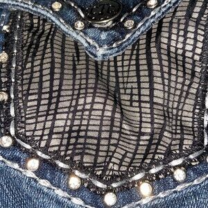 Cowgirl Tuff Co stretch, bootcut, Jazzy embellished pocket, silky snake print and gemstones on pocket low rise heavy weight denim