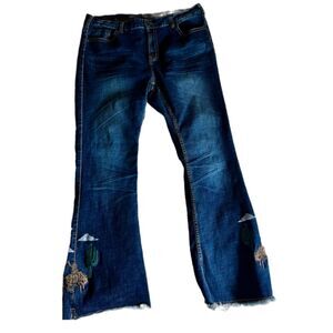 Cowgirl Tuff bootcut oasis trouser jeans with a bucking horse and cactus desert embroidery at each leg, has a small split on each raw hem,