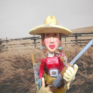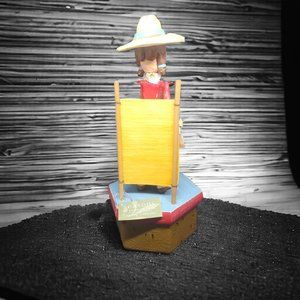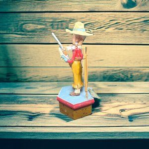 Discontinued and limited edition cowboy figure Stands with her Riffle on top of an embellished treasure box. Perfect gift for the country girl on your list.