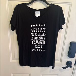 Black V-neck tee with bold white text: 'What Would Johnny Cash Do?'