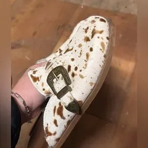 Stylish and comfortable slip-on shoes in a charming brown and cream design. Perfect for everyday wear. Hair on hide maybe worn twice